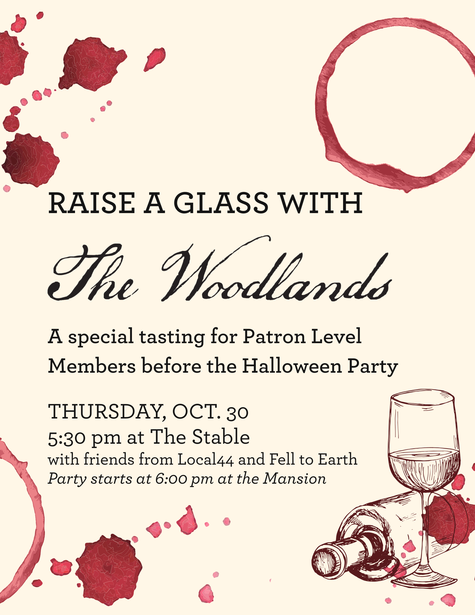 Join Patron Level Members of The Woodlands for a special VIP event in the Stable. Friends from Local 44 and Fell to Earth will pour selections of vermouth, and Third Wheel Cheese will provide cheese for Patron Level Members before the Member’s Halloween Party begins at 6:00pm.